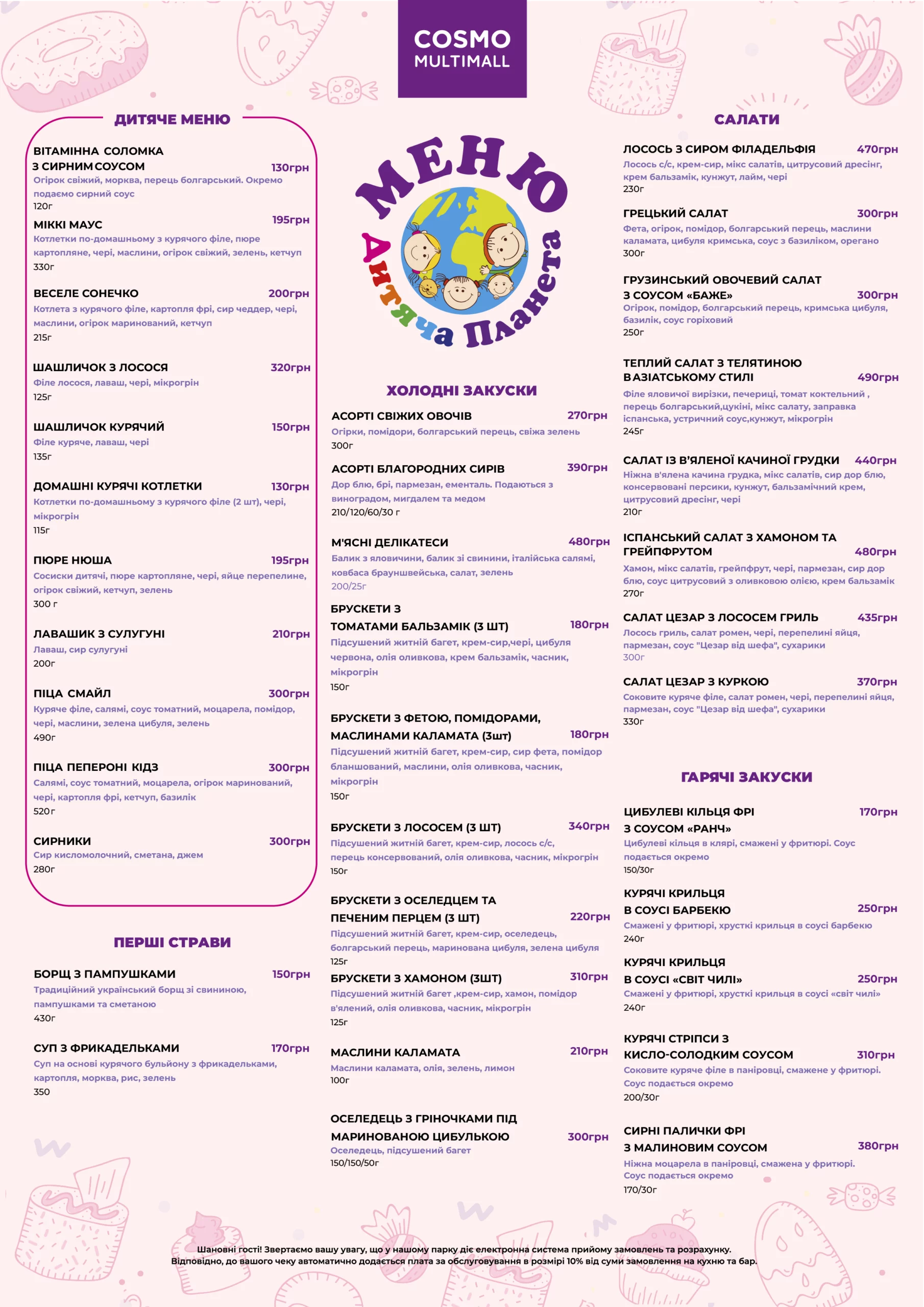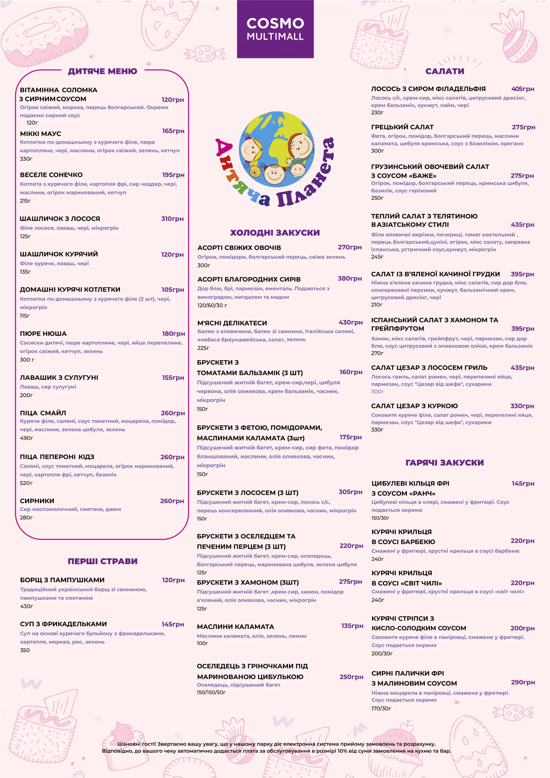 В ресторані Дитяча Планета в Cosmo Multimall ви можете скуштувати страви на будь-який смак! Наші висококваліфіковані кухарі готують страви національної та європейської кухонь, дитяче та сезонне меню. Усі страви ми готуємо лише з відбірних, якісних та свіжих продуктів. Ідеальний бенкет до дня народження, легкий перекус або повноцінний обід під час відпочинку у нашому парку -в асортименті нашого меню кожен знайде для себе найсмачніше рішення.