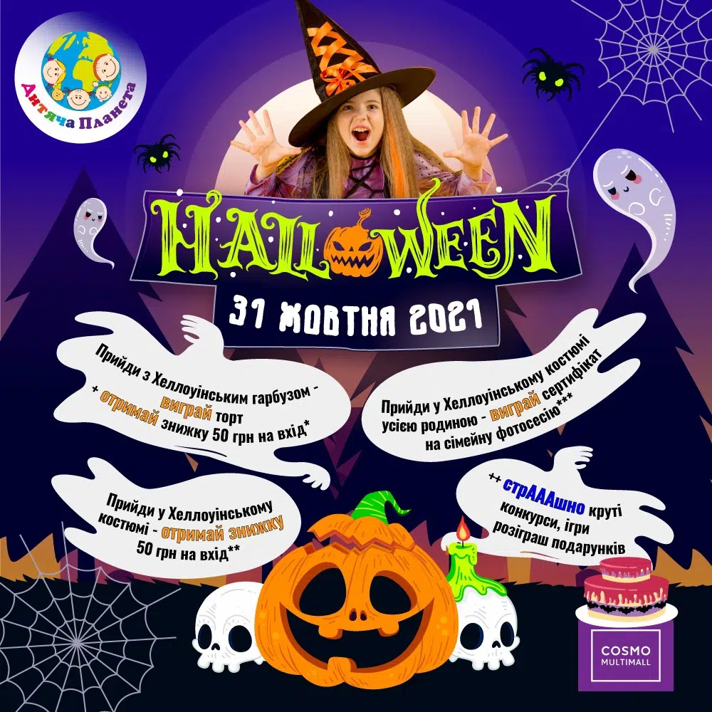 І в Дитячій Планеті буде, як завжди стрАААААААшно весело!!!👻👻👻 3️⃣1️⃣ жовтня – запрошуємо на справжні монстрячі активності🧟♀️👺☠️ 🎃 Прийди у Хеллоуінському костюмі усією родиною – виграй сертифікат на сімейну фотосесію👨👩👧👦 🎃 Конкурс – прийди в Дитячу Планету з хеллоунським гарбузом – виграй торт🍰 за найкращий гарбуз🎁 🎃 Усім, хто прийде зі своїм гарбузиком – знижка на вхідний квиток у парк …