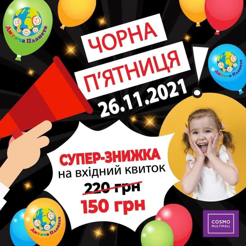 ЧОРНА П’ЯТНИЦЯ вже наближається🔜🤩 в Дитячу Планету! 2️⃣6️⃣ листопада будемо вражати СУПЕР ЗНИЖКАМИ! 🔥 Вхідний квиток у парк на весь день 150 грн для КОЖНОГО ВІДВІДУВАЧА🤘🔥 *знижка на вхідний квиток ДІЄ для запрошених гостей на святкування дня народження. А ми нагадуємо, що з 1-го листопада Київ перейшов у «червону зону». Дитяча Планета працює у звичному режимі, але на цей період …