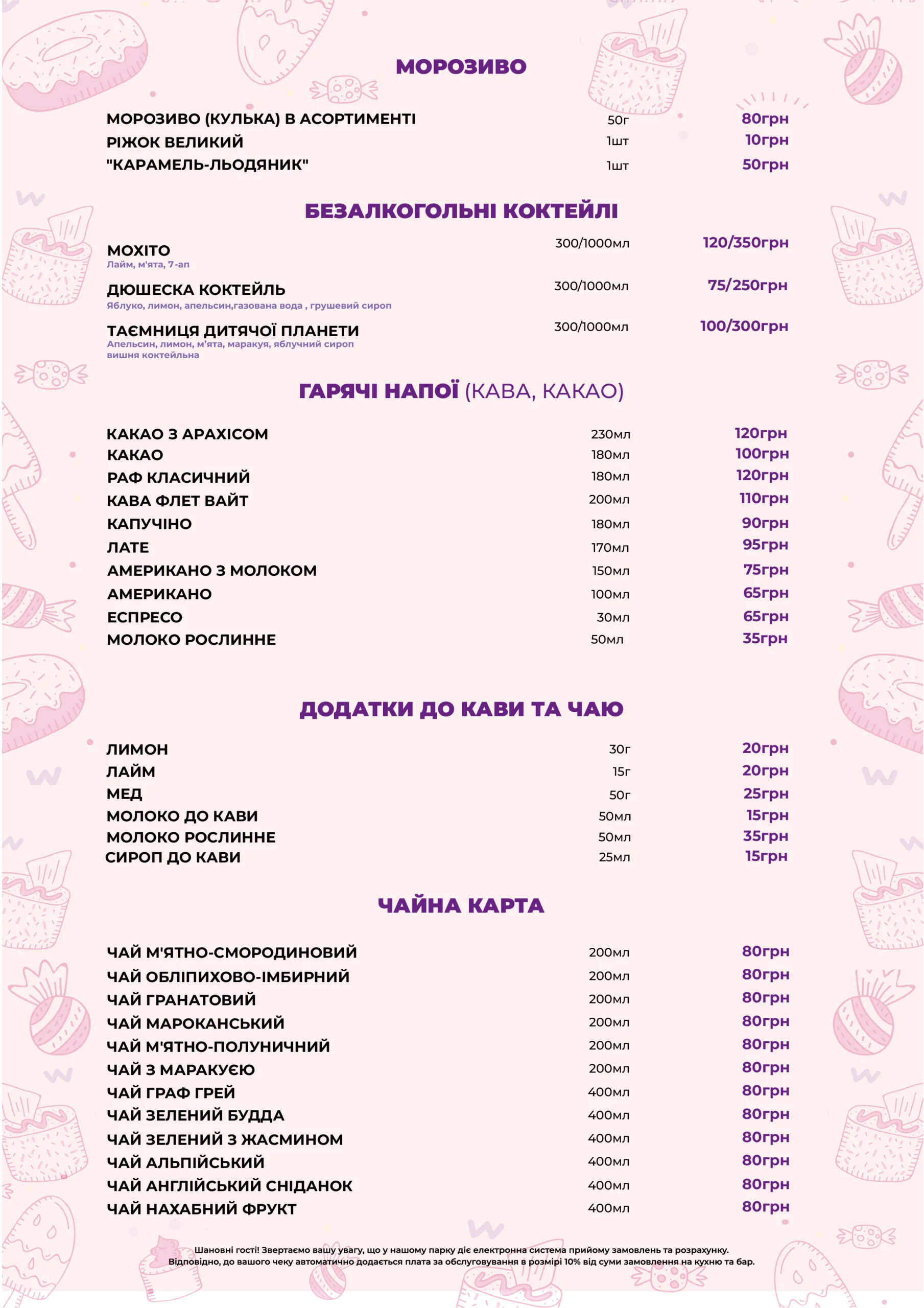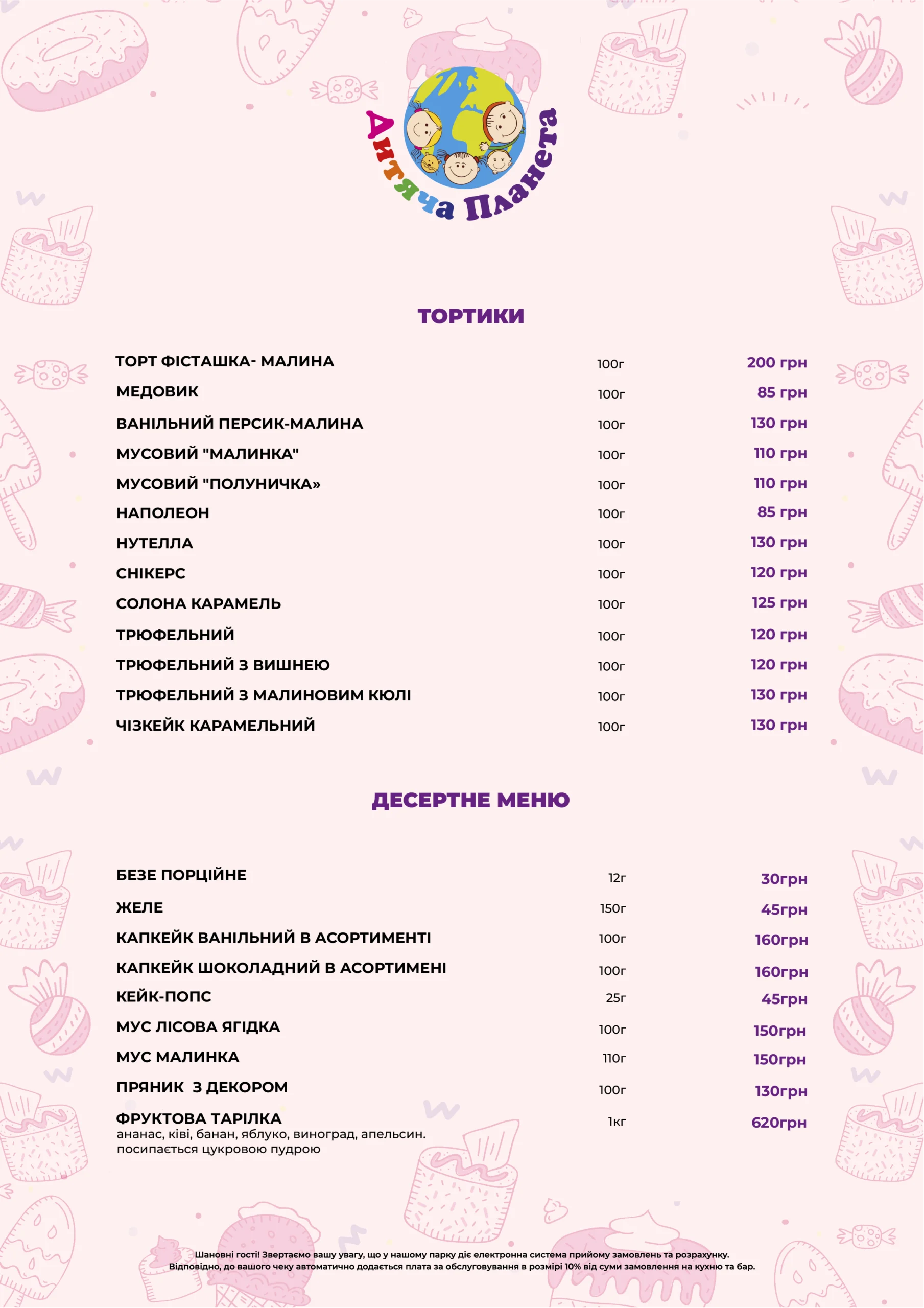 У власній кондитерській парку розваг «Дитяча Планета» у Cosmo Multimall на вас чекають неповторні торти та десерти нашого власного виробництва. Ми готові створити для вашого свята торт із будь-яким декором та улюбленим героєм вашої дитини — чи то на день народження, випускний, чи будь-яке інше свято. Навіть просто завітавши до нас відпочити, ви зможете обрати сві